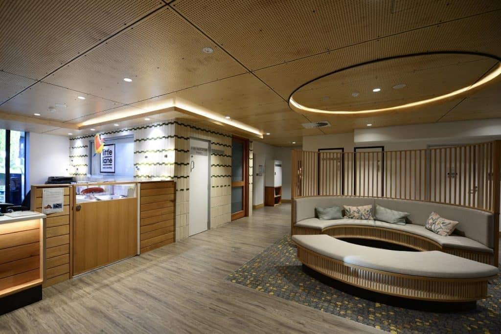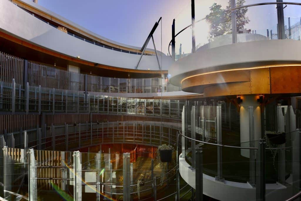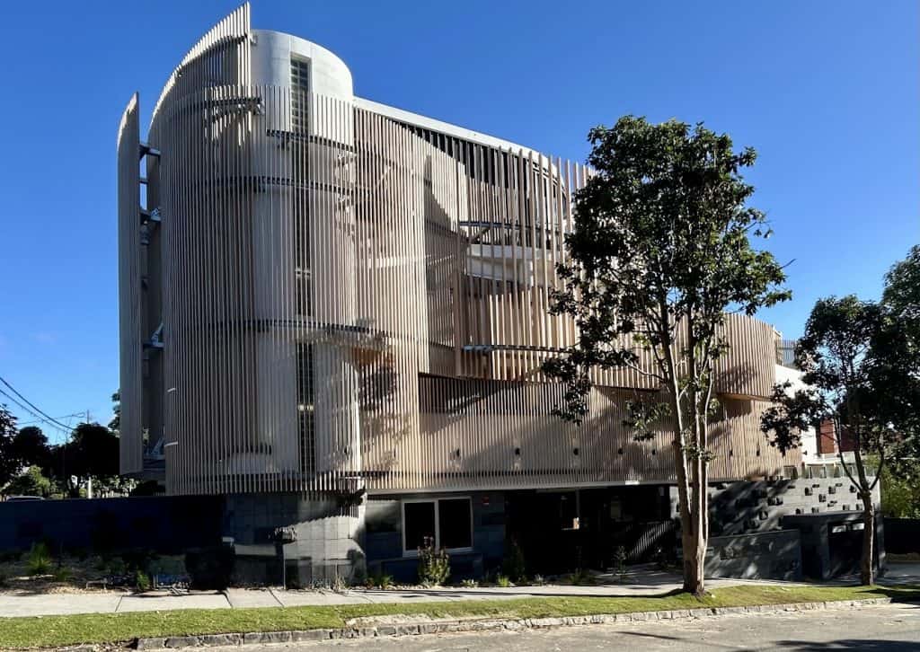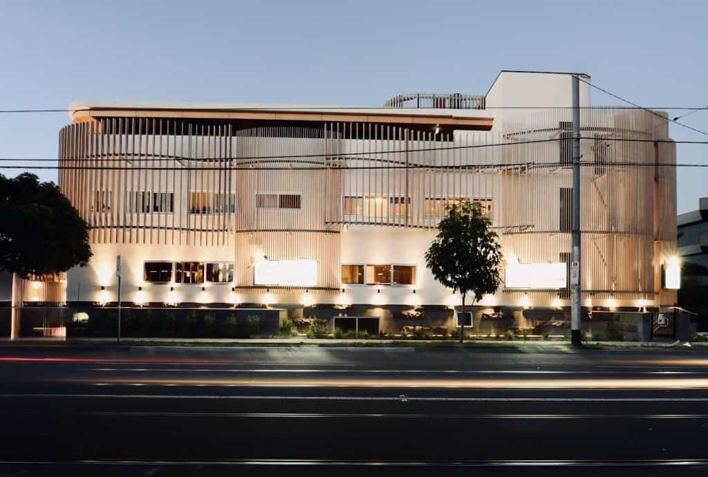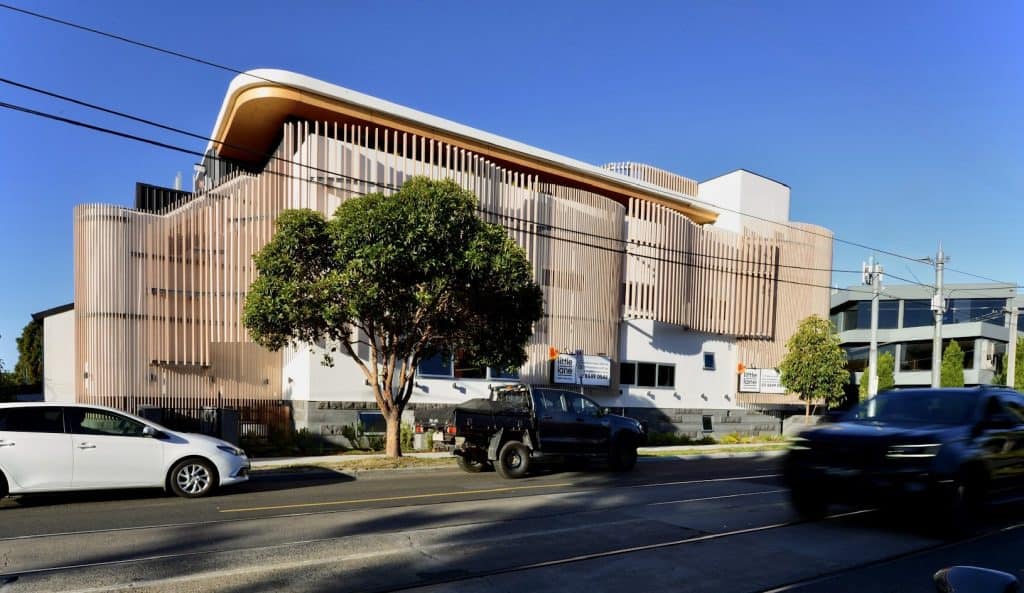 Glen Iris is a flagship centre in Melbourne. It has a central ramp that winds its way form the ground entry level to the 4th floor. The ramp allows a continued connection between the open space areas on each of the levels. The form is reminiscent of the modernist styles with minimalist detailing screening the outer skin in vertical battens, The battens play with shadows and light across the facade during the day and filter and disperse the lighting at night.